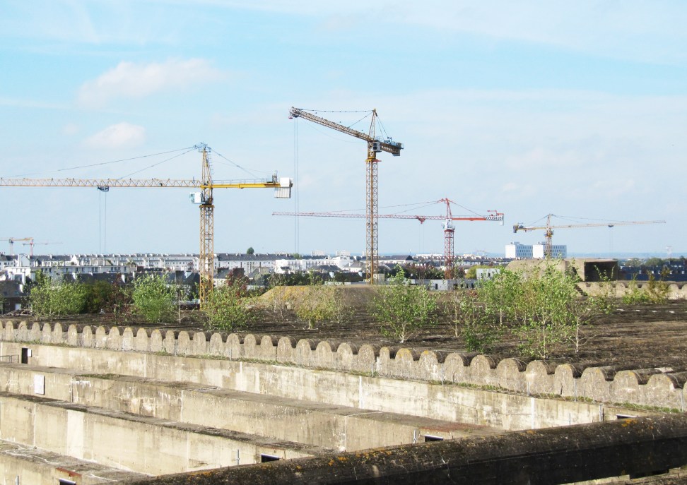 Carré, lessivée par la pluie, la masse de béton de la base sous-marine de Saint Nazaire s’élève à 20 mètres du sol sur une superficie d’1 hectare. Sur le toit, 9 chambres d’explosions étirées sont coiffés par des travées perpendiculaires striant la lumière.
