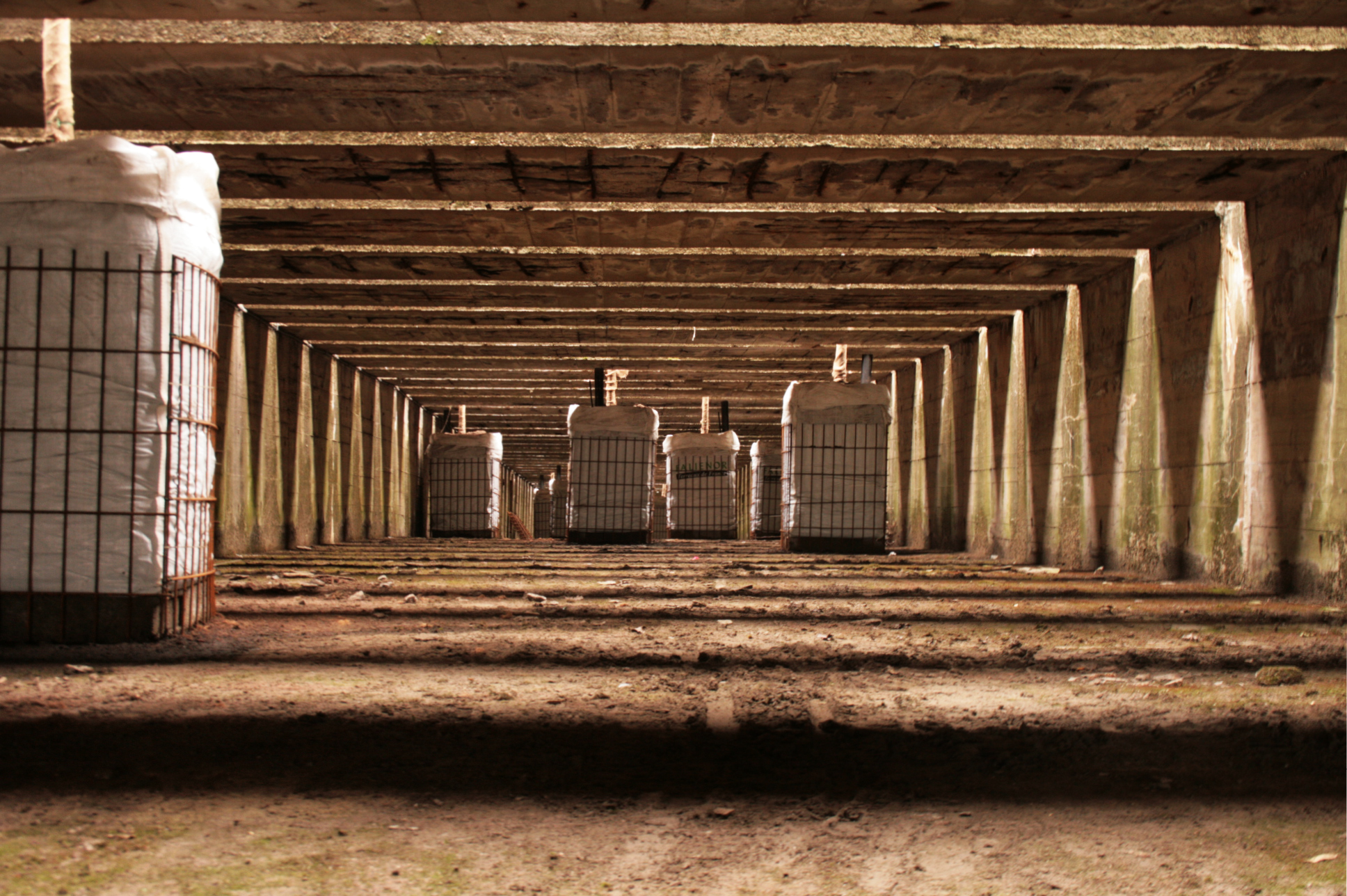 Carré, lessivée par la pluie, la masse de béton de la base sous-marine de Saint Nazaire s’élève à 20 mètres du sol sur une superficie d’1 hectare. Sur le toit, 9 chambres d’explosions étirées sont coiffés par des travées perpendiculaires striant la lumière.