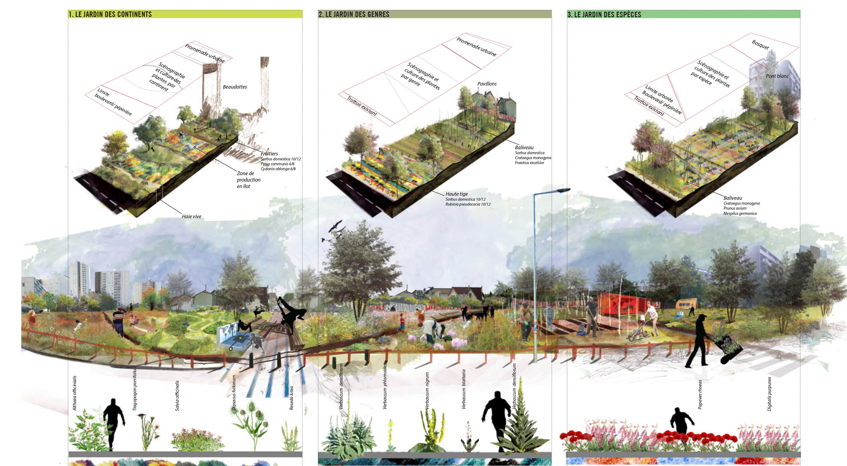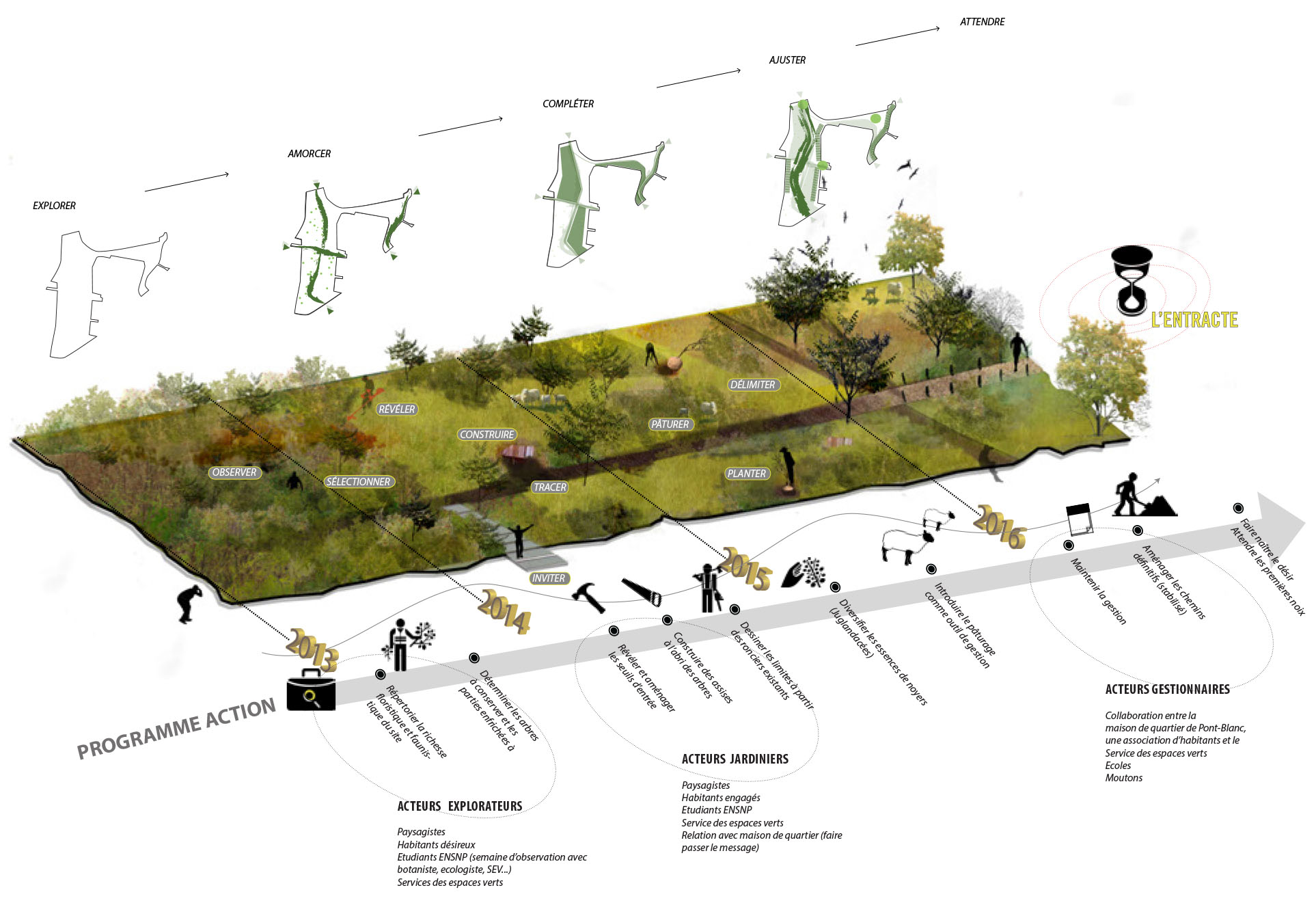 Dans une ville sans budget, l’action du paysagiste peut être de proposer un réseau d’espaces jardinés basé sur les pratiques sociales et la matrice du vivant. Le projet s’inscrit dans une dimension temporelle organisée en cinq »programme-action » sur des échantillons de territoire donnés. Le plan masse émerge à la fin du processus de création comme un témoignage de l’expérience collective du terrain.
