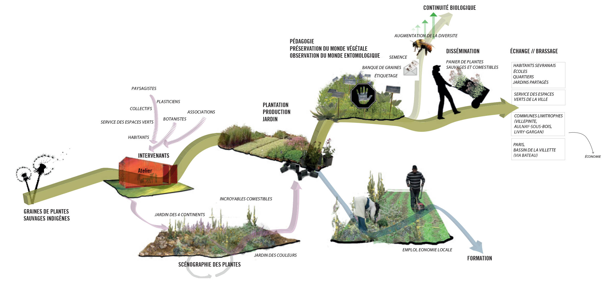 Il s’agit de développer une pépinière expérimentale de plantes sauvages. Un ample bas-côté de route est semé par genre, par espèce et par continent d’origine. Le semis est l’outil fondamental du processus de création et fait appel à la gratuité du vivant et à l’inventivité du jardinier. Cet index botanique est à la fois une banque de graines, un espace de préservation de notre patrimoine vivant et d’observation du monde enthomologique. Des »paniers des cinq continents » sont distribués aux habitants et acheminés par voie d’eau au bassin de la Villette via le canal de l’Ourcq.
