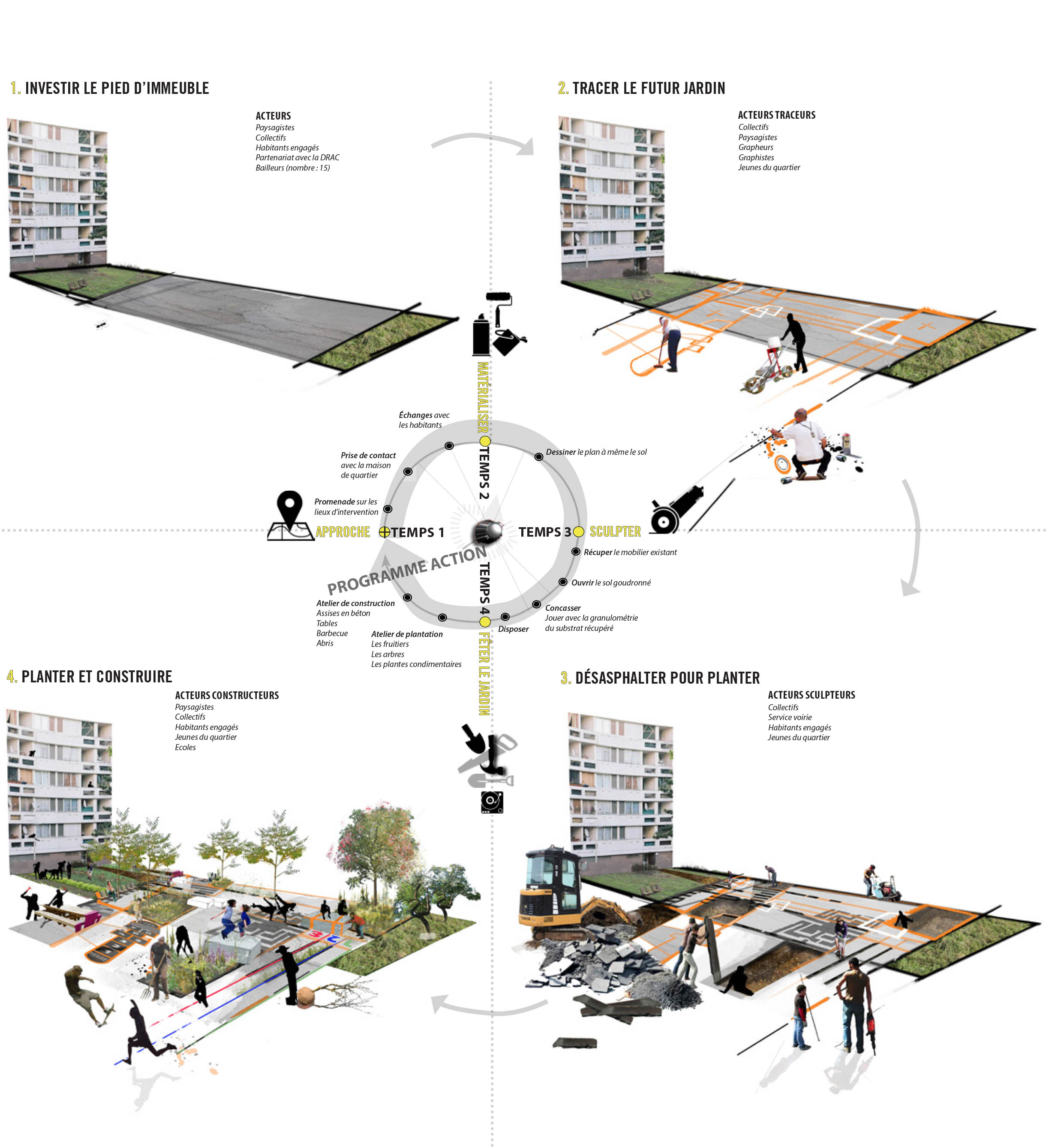 Le droit au jardin va de pair avec le droit au logement. Le socle des tours est investi par les habitants. Une délégation de jardiniers est constituée et accompagnée par le bailleur, des collectifs, des graphistes et des paysagistes. Le futur jardin est dessiné à même le sol. Les »acteurs-sculpteurs » ouvrent le bitume qui laisse place au jardin vivrier, lieu de rencontre intergénérationnelle.