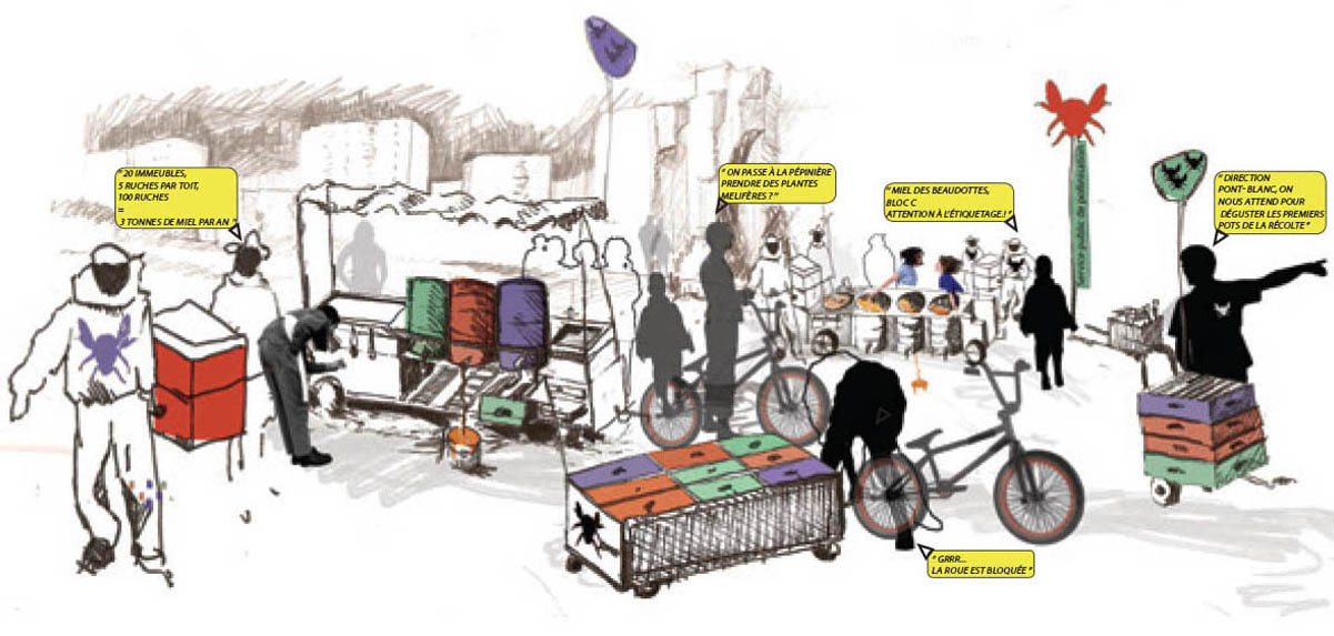 Elles permettent de savourer les interstices de la ville. Le mouton, outil de valorisation des pieds d’immeubles, permet de gérer les espaces délaissés. La miellerie ambulante récolte les miélées sur les toits d’immeubles. Le confiturier est un cortège constitué de glaneurs-cueilleurs et révèle l’arrière-cour vivrière des parcelles privées. Il traverse les zones pavillonnaires pour récolter le surplus de fruits de 4500 jardins.