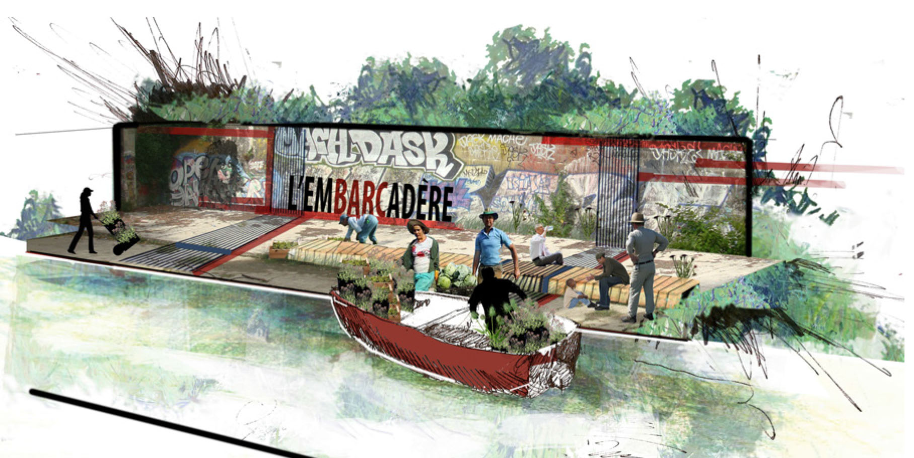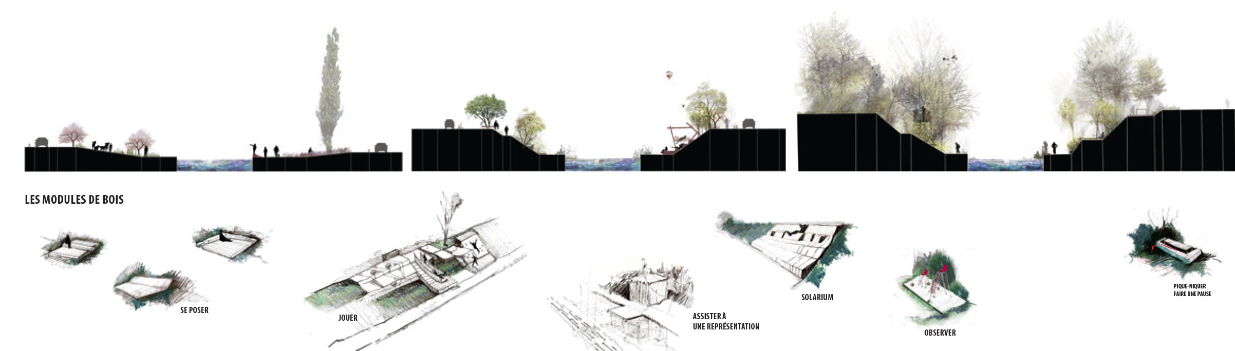 Ce travail s’affiche comme un programme de recherches et d’actions artistiques. Les emplacements sont investis par un chantier d’insertion, des collectifs d’artistes et une équipe de jeunes des quartiers associés à des étudiants en paysage. Des modules en bois font office d’assise, de points d’observation de la nature, de solarium ou d’aire de jeux. Un embarcadère est construit sur une rampe de mise à l’eau pour acheminer les productions locales au cœur de la capitale.